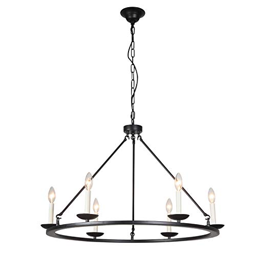 - Unique Lamp Design----The more simple, the design of restoring ancient ways, Rustic wagon wheel chandelier, especially designed to illuminate the heart of your living room, foyer, dining room or farmhouse styled places. Crafted of metal in black finish, this design features 3 sloping metal chains topped with 6 candle-shaped bulb stems with dish cups.